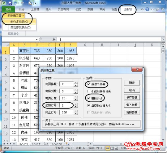 在“多排表工具”对话框中设置各相关参数,注意“起始行号”设定为正式数据开始行,一定要勾选“新增工作表”和“清除公式”两项,点击“确定”后即可自动在新建工作表中进行分栏操作,很快就能得到分栏表格。