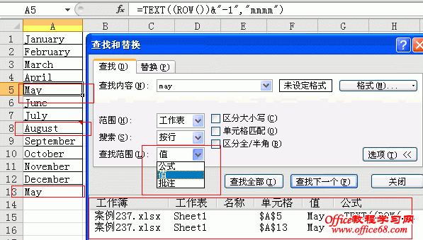 Excel提供了公式、值、批注的查找。比如,下面图中,A5、A13、A8单元格都有“May”,但A5为公式结果,A8为批注,A13为输入的值,在实际使用时,可以按需查找。