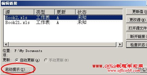 2.在“编辑链接”对话框中,单击“启动提示”按钮,弹出“启动提示”对话框,选择“不显示该警告,同时也不更新自动链接”,单击“确定”按钮。
