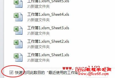 单击“文件→最近所用文件”,在“最近使用的工作簿”列表的底部勾选“快速访问此数目的‘最近使用的工作簿’”选项,并在其右侧设置一个适当的数值。