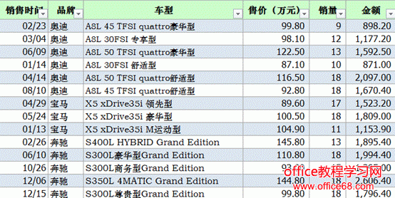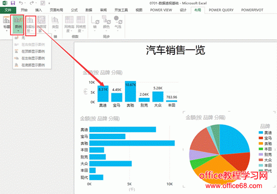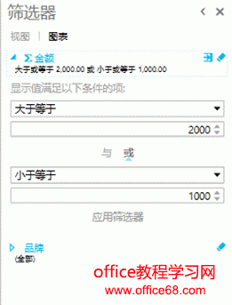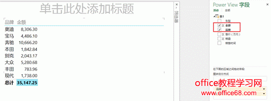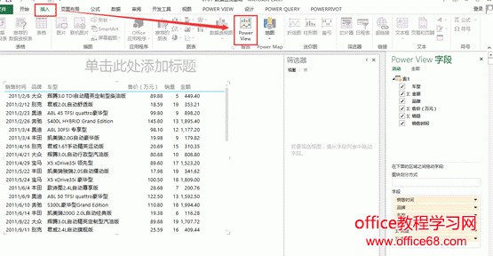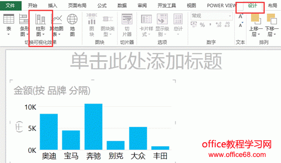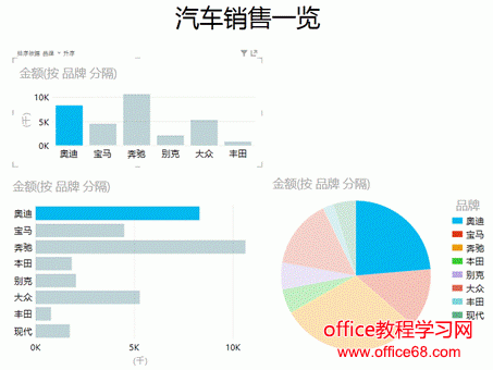 ![]() 图1 针对一组表格数据制作Power View动态表,只需要将鼠标放在有数据的表格中的任意单元格,接下来在【插入】选项卡下单击【Power View】,即可生成如图2所示的图表界面。 ![]() 图2 界面主要包含三部分:最左边的是显示画布区,可以放置多个Power View表格或Power View图表,中间是筛选器,右侧是字段列表显示区。 在【字段列表】中可以通过复选框筛选字段,未选中的字段可以不显示在图表中。比如图3中,我仅对品牌与金额进行筛选。 ![]() 图3 【筛选器】中可以使用滑块对各个字段的数值进行范围筛选,也可以自己设置筛选条件。如图4中,可以将金额筛选为大于等于2000或小于等于1000的数据。并应用筛选器。 ![]() 图4 我们可以根据此时筛选出的数据制作图表,首先我们可以在【设计】选项卡下点击【柱形图】中的簇状柱形图,效果如图5所示。 ![]() 图5 接下来,我们可以依次生成条形图、饼图等多样的图表。也可以在顶部输入标题,也可以在【设计】选项卡-【图例】中修改图例的位置,也可以为图表添加数据标签。如图6所示。 ![]() 图6 此时,我们生成的3种类型的图表是有关联的,当我们点击一种图表中的一个车型时,其他2个图表也会相应发生动态的变化。如图7,我点击上方柱形图中的“奥迪”车型,下方条形图和饼图中“奥迪”的系列会变亮,其他系列颜色会变暗,起到动态突出显示的作用。 ![]() 图7 |