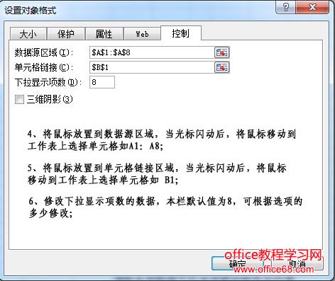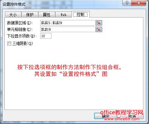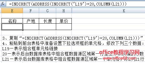 这样,一个运用开发工具中的窗体控件和函数的下拉列表框就做成了。按组合框的下拉箭头,即可选择右表作数据库的表中各列数据。右边作数据库用的表格是作后台用的,可以远离前台表格,还可以把单元格链接数隐藏起来。 注意;此类下拉选框制作成功之后,单元格不能随意拖动,拖动后须修改函数中的数据 列表解说制作下拉列表框函数中的三个数据