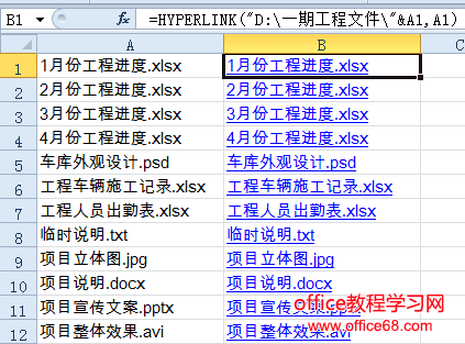 具体操作时,公式中的"D:\一期工程文件\"部分,换成实际的文件夹地址。 ![]() OK,项目文件目录制作完毕,单击超链接,即可打开对应的文件。 ![]() |