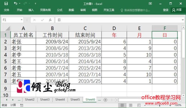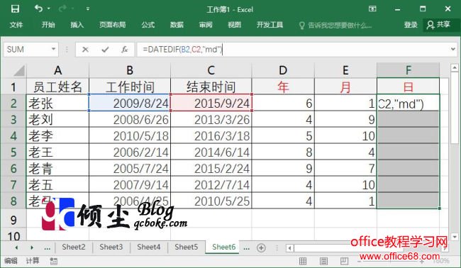 3.最后操作表格中的的“F2:F8”单元格区域,之后在编辑栏中输入公式“=DATEDIF(B2,C2,”md”)”,输入完成点击“Ctrl+Enter键”完成公式的操作,此时单元格中已经获取了日的间隔值。如下图