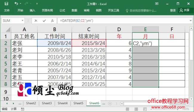 2.继续选中表格中的“E2:E8”单元格区域,之后在编辑栏中输入公式“=DATEDIF(B2,C2,”ym”)”,输入完成点击“Ctrl+Enter键”完成公式的操作,此时单元格中已经获取了月的间隔值。如下图