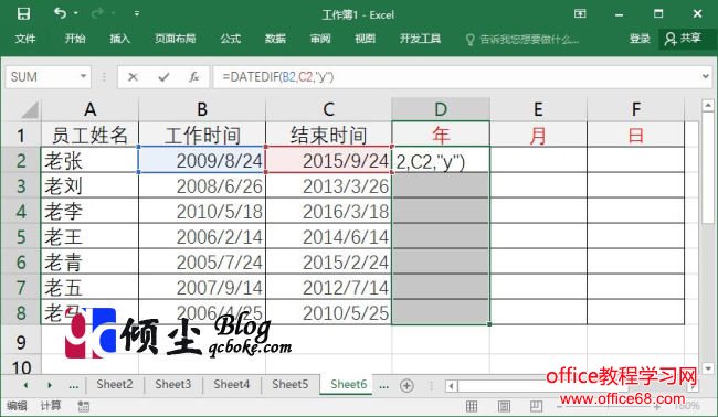 在使用Excel做一些使用到日期时间等数据时,有的时候我们需要计算出两个时间之间的间隔,如果单独进行计算的话太麻烦而且浪费时间。下面说下如何使用使用Excel表格计算两个日期间的间隔的方法 操作步骤1.打开Excel工作表格,选中表格中的“D2:D8”单元格区域,之后在编辑栏中输入公式“=DATEDIF(B2,C2,”y”)”,输入完成点击“Ctrl+Enter键”完成公式的操作,此时单元格中已经获取了年的间隔值。如下图