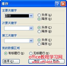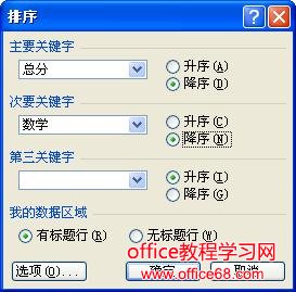 (3)在该对话框的“主要关键字”下拉列表中选择“总分”选项,并选中其后的“降序”单选按钮;在“我的数据区域”选区中选中“有标题行”单选按钮,表示在排序时标题行不参与排序,如果选中“无标题行”单选按钮,则表示在排序时标题行参与排序。一般情况下,标题行不参与排序,本例选中“有标题行”单选按钮。
