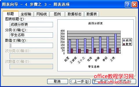 (5)单击“下一步”按钮,弹出“图表向导-4步骤之3-图表选项”对话框,在该对话框中输入图表的标题及分类(X)轴的值,如图4所示。 图4 输入图表的标题及分类(X)轴的值