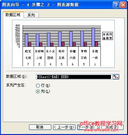 (3)在“图表类型”列表框中选择“柱形图”选项,在“子图表类型:”选项区中选择图表的子类型,单击“下一步”按钮,弹出“图表向导-4步骤之2-图表源数据”对话框,如图所示。 图2 “图表向导-4步骤之2-图表源数据”对话框