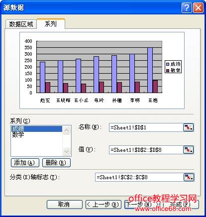(4)单击“系列”标签,打开“系列”选项卡。在“系列”列表框中选择一个系列名,在“名称”文本框中输入系列的名称,在“值”文本框中选择系列对应的值区域,如图3所示。 图3 输入系列的名称及值