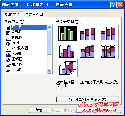 图表是工作表数据的图形表示,用户可以很直观地从中获取大量信息。Excel 2003提供的图表有柱形图、条形图、折线图、饼形图、XY(散点图)、面积图、圆环图、雷达图、曲面图、气泡图、股价图、圆柱图、圆锥图和棱锥图等14种类型,而且每种图表还有若干个子类型。 图1 “图表向导-4步骤之1-图表类型”对话框