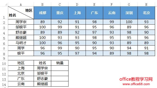 先看规律,姓名在姓名列表中的第几位,就是向下移动几行,地区在地区列表的第几位,就是向右移动几列。