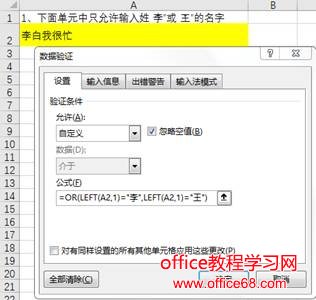 步骤:先选中A列,然后点击数据->数据验证(2013版之前的叫作数据有效性),然后在自定义输入框中输入=OR(LEFT(A2,1)="李",LEFT(A2,1)="王"),按确定。