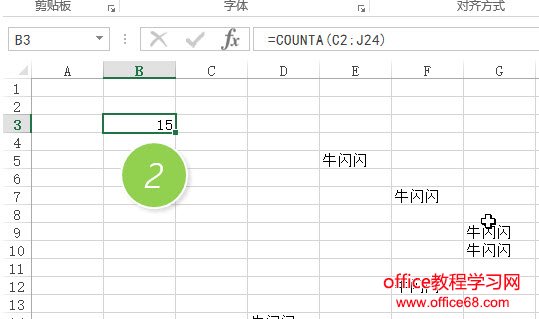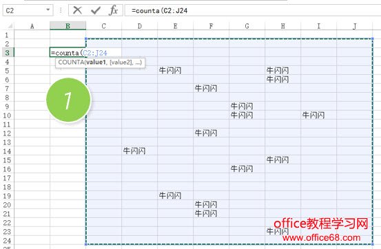 可以在B3单元格输入=counta() 然后用鼠标选取C2:J25单元格,如下图1处所示: