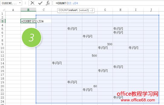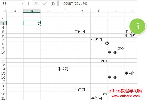 也许有小伙伴问,如果我想统计区域内数值的个数呢?比如下例中区域内有300,500,60等这样的数值,应该如何统计呢?这个时候需要用过到count函数。输入方法和counta函数一样。看下图3处。