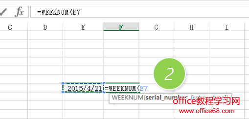 具体操作如下: 在日期的后面输入=w这是Excel自动出现W开头的函数,单击选择WEEKNUM。如下图1处