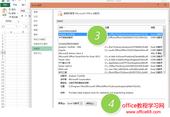 大家一定要亲自操作一下,你就发现问题。 发现什么问题?WEEKNUM函数你的Excel压根就没有。 这是什么鬼情况?听牛闪闪继续道来。 这个函数系统默认出现,要出现需要加载“分析数据工具库”工具。 加载方法如下: 打开“文件-选项”,打开Excel选项,在加载项里找到“Analysis Toolpak”(下图3处),然后点击“转到”(下图4处)