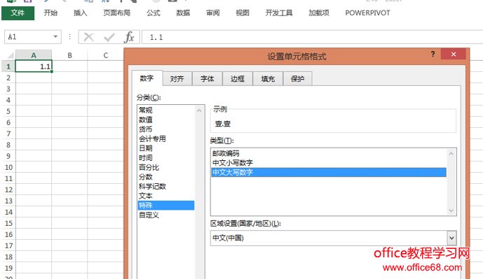 选中1.1所在的单元格,然后设置特殊,选择中国文大写数字。