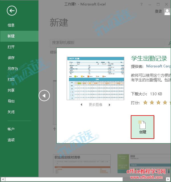 1 打开Excel2013,单击“文件”,再选择“新建”,找到“学生记录出勤表”。如图所示。