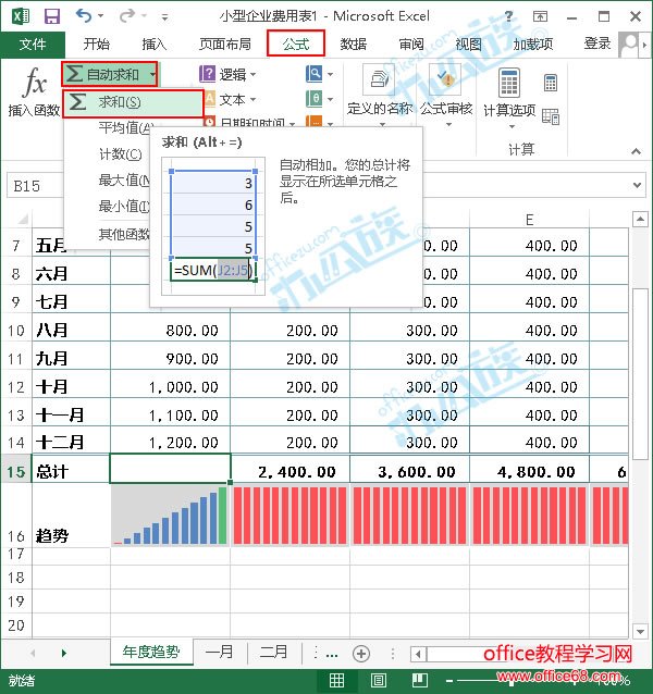 2 单元格会变成下图所示的样子,然后按“回车”,总和就求出来了。