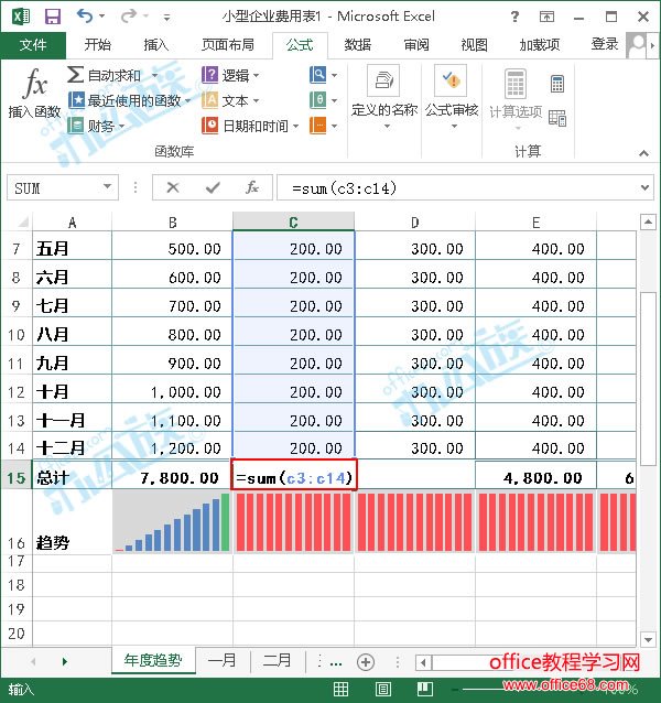 1 打开Excel工作簿,选中要求和的单元格,然后在单元格输入“=sum(c3:c14)”,按“回车”,求和完毕,如图。