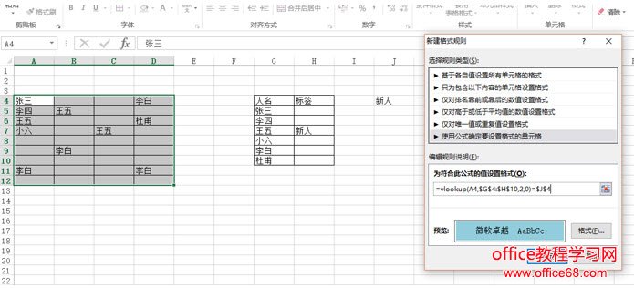 意思是:从A4单元格开始判断,如果A4:D12中人名逐个与G4:H10的表格进行匹配,如果等于J4,J4单元格内容正好是“新人”,则变成蓝色。