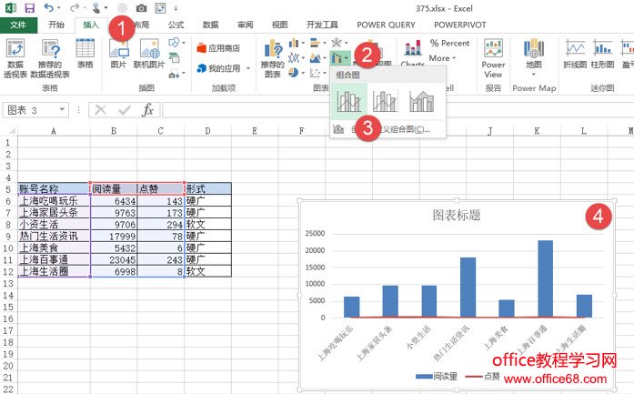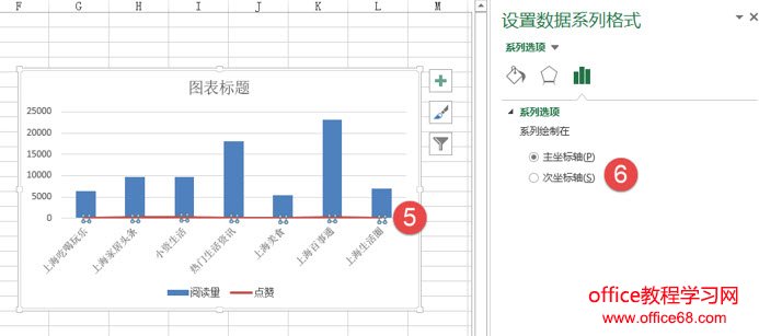 第二步:设置次坐标轴 看4图,会发现折线几乎是一条直线,原来是数据很中“阅读量”和“点赞”的数量级别差的太大。导致折线图看上去像一条直线,这个时候就需要将“点赞”的数据置于次坐标。选中折线(下图5处),按Ctrl+1打开右侧的设置面板,将系列绘制在勾选“次坐标轴”。(下图6处)