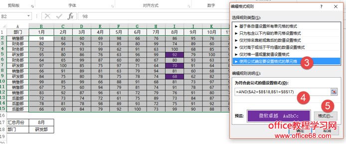 第二步:设置公式 在新弹窗口中,选择“使用公式确定要设置格式的单元格”(下图3处),在下图4处输入公式: =AND($A2=$B$18,B$1=$B$17),并设置格式为底色为紫色,白色字体。