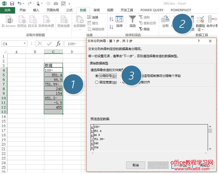 另外一种方法就是用分列功能。具体操作如下: 选中下图数据区域,然后点击“数据—分列—分隔符号”(下图3处)