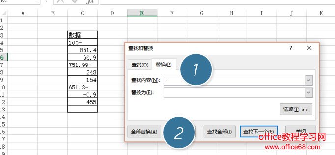 问题:如何快速知道单元格是否为文本还是数值格式? 解答:利用替换或分列来进行快速的数据整理。 第一种方法用替换。具体操作如下: 将光标放在任意处,然后按Ctrl+H打开替换模式,将–替换成 空即可,点击“全部替换”即可。(下图1处)