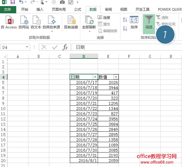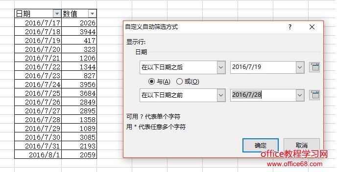 举例,筛选2106/7/9到2016/7/28之间的数据,设置方法如下图。注意用“与”方式。