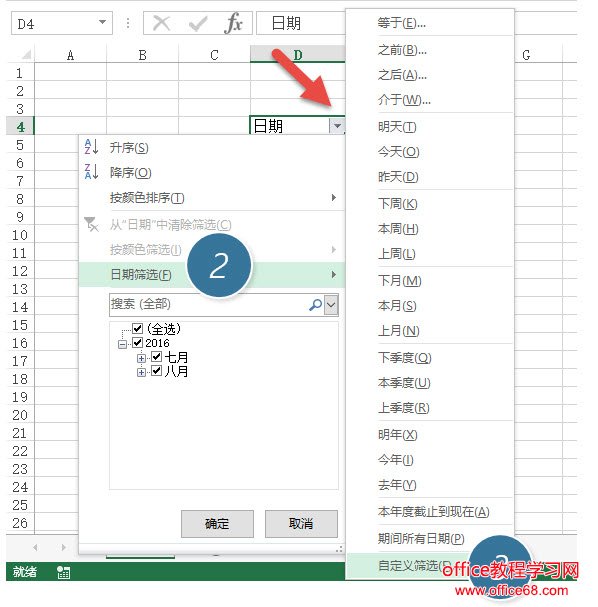 点击D4单元格的筛选按钮,点击“日期筛选—自定义筛选”(下图3处)
