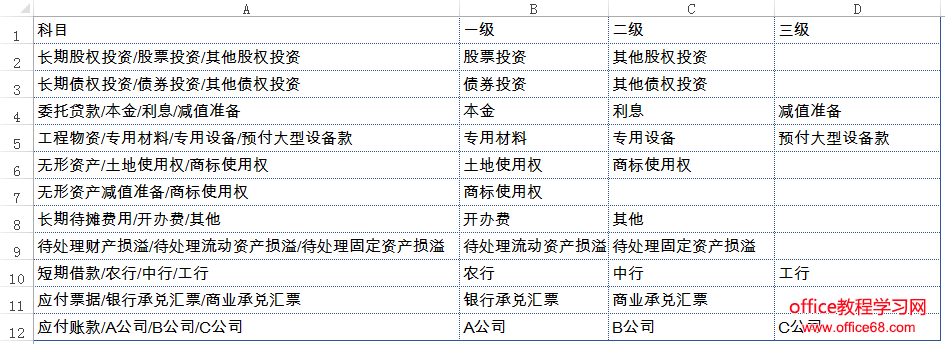 我们在做会计科目的时候,有时候会需要把科目明细分开,比如明细科目1、明细科目2等等。 如同下面这样的一张会计科目表,我们需要将A列的科目明细分开,分别放在BCD列。