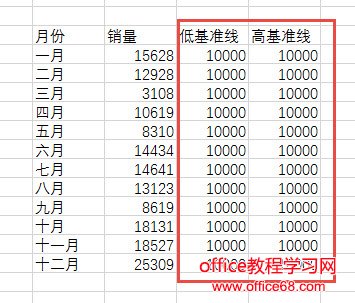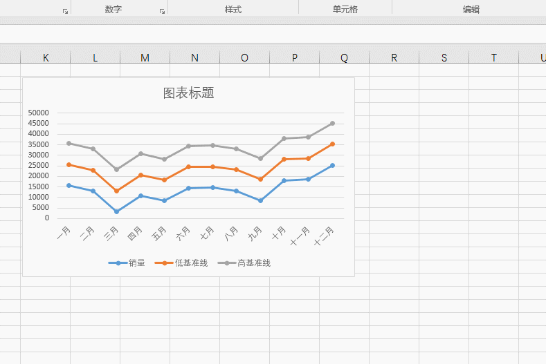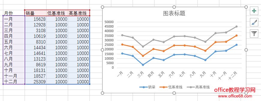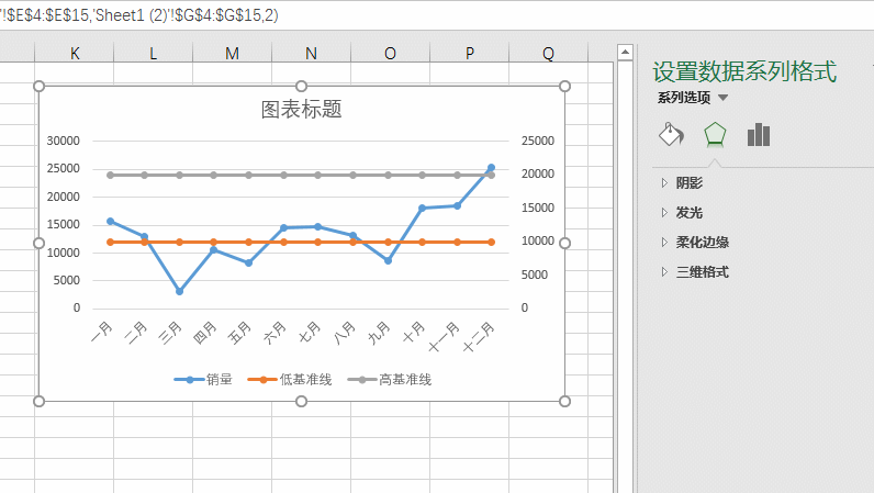 插入后发现两个10000自动堆积上去了,明显不是我们想要的,所以要继续改进, 选中低基准线那条折线,按ctrl+1打开设置选项,将两个高低基准线改成次坐标。注意看下动图操作:
