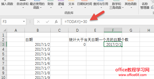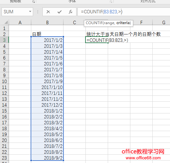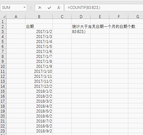 本例的难点在于,如何写大于的条件,大于比当前日期多一个月的日期。 当前日期是today(),大于30天就是today()+30。如果写进公式应该是这样的: =COUNTIF(B3:B23,">today()+30")