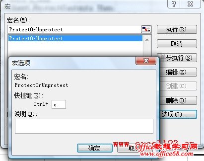 在Excel中经常进行设置密码的保护工作表或撤消工作表保护的操作时,每次都单击菜单或功能区中的“保护工作表”命令,并在对话框中设置密码显得有些繁琐。如果能用快捷键来保护工作表或取消工作表保护就方便多了。下面的宏就可以实现这个目的。 1.按Alt+F11,打开VBA编辑器,单击菜单“插入→模块”,在代码窗口中粘贴下列代码: Sub ProtectOrUnprotect() 代码中保护工作表和撤消工作表保护的密码都为“123”,可根据需要自行更改。 2.返回工作表界面,按Alt+F8,打开“宏”对话框,选择“ProtectOrUnprotect”宏,单击“选项”按钮,为该宏指定一个快捷键,如输入字母“e”,则快捷键“Ctrl+E”则为执行该宏命令的快捷键,如图。 3.单击“确定”,关闭“宏”对话框。以后选择某个工作表,反复按快捷键“Ctrl+E”即可在保护工作表和撤消工作表保护之间切换。需要注意的是,执行宏命令前须确保工作簿已设计完毕,因为宏命令运行后将无法撤消到工作簿以前的状态。 |