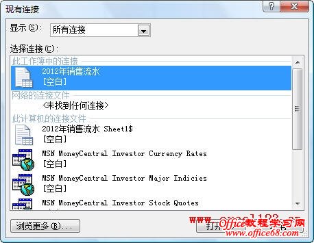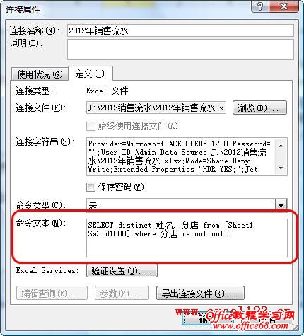 1.添加连接。 先保存工作簿,然后选择“数据”选项卡,在“连接”组中单击“链接”,弹出“工作簿连接”对话框。在对话框中单击“添加”按钮,打开“现有连接”对话框,单击“浏览更多”按钮。 在“选取数据源”对话框中找到并选择当前工作簿后单击“打开”,弹出“选择表格”对话框。假如上述表格在“Sheet1”表中,选择“Sheet1”后确定。这时Excel在工作簿中添加了一个连接,连接的名称与当前工作簿相同。 2.在“工作簿连接”对话框中单击“属性”按钮,弹出“连接属性”对话框,选择“定义”选项卡,在“命令文本”中输入SQL命令: select distinct 姓名, 分店 from [Sheet1$a3:d1000] where 分店 is not null 其中“select distinct ”语句返回字段中的不重复值,“[Sheet1$a3:d1000]”指定表及数据区域。单击“确定”,关闭“工作簿连接”对话框。 3.创建数据透视表。在功能区中选择“数据”选项卡,在“获取外部数据”组中单击“现有连接”,弹出“现有连接”对话框。在“此工作簿中的连接”下找到上述添加的连接,本例为“2012年销售流水”。 双击该连接或选择该连接后单击“打开”按钮,弹出“导入数据”对话框,选择“数据透视表”,并设置数据透视表的存放位置后确定。。 在“数据透视表字段列表”中将“分店”和“姓名”两个字段分别拖到“行区域”和“数值”区域即可。 另外,还可使用Microsoft Query来创建数据透视表,步骤如下。 1.在功能区中选择“数据”选项卡,在“获取外部数据”组中单击“自其他来源→来自Microsoft Query”,弹出“选择数据源”对话框,选择“Excel Files*”,单击“确定”按钮。此处默认已勾选“使用‘查询向导’创建/编辑查询”选项。 2.弹出“选择工作簿”对话框,找到并选择当前工作簿后确定。 这时会弹出“查询向导”对话框。如果此时Excel提示“数据源中没有包含可见的表格”,“可用的表和列”区域为空,可用下面的方法让可用的表显示出来:单击对话框中的“选项”按钮,在弹出的对话框中同时勾选“表”和“系统表”后单击“确定”。有时对话框中的两个选项已处于选中状态,但“可用的表和列”区域仍然为空,可先取消选择“系统表”单击“确定”后,再次选择“系统表”并确定。由于数据在“Sheet1”工作表中,此处选择“Sheet1$”,单击“>”按钮将其添加到“查询结果中的列”区域中。 接着单击三次“下一步”及“完成”按钮关闭“查询向导”,弹出“导入数据”对话框,单击“属性”按钮,弹出“连接属性”对话框,选择“定义”选项卡,在“命令文本”中输入上述SQL命令。 |