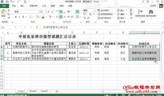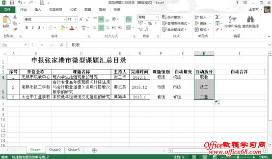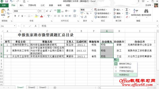 3、自动合并 在以前的版本中,如果要完成合并,那么需要播放辅助列或使用公式,对于初级用户来说显然是相当复杂,而Excel 2013在这方面就比较简单: 在第一个单元格输入合并之后的结果,例如“无锡市职教中心张玉华”,向下拖曳填充柄至适当位置,此时你会看到单元格都显示相同的内容;选中这些单元格,在快捷菜单选择“快速填充”,我们就可以迅速看到更新之后的合并效果(见图4)。当然,应用“快速填充”规则后,我们可以按照自己的意愿进行重新合并,合并结果会自动更新,例如“张玉华校级”。