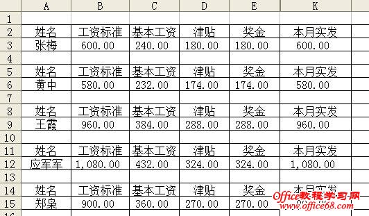 用同样的方法在空行区的辅助列中填充数列3、6、9……,在人员名单区的辅助列中填充2、5、8……。最后完成图如下。
