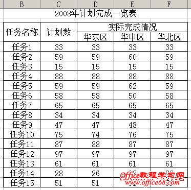 Excel可以按行或按列比较单元格中的数据并找出其中的不同。下面我们来看一个具体的例子。假如某公司年初给其各地区分公司下达了任务指标数,年终各分公司完成情况如图所示: