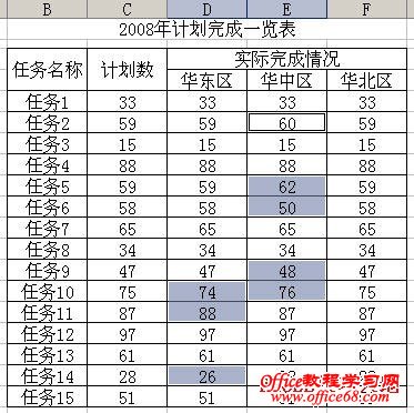 可以看到,Excel找到了这些单元格并高亮显示出来,各分公司完成任务情况就一目了然了 |