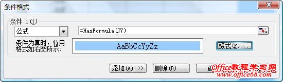 3.单击菜单“格式→条件格式”,单击“条件1”下的下拉列表,选择“公式”,然后在右侧文本框中输入“=HasFormula(J7)”,J7为第一个含有公式的单元格。