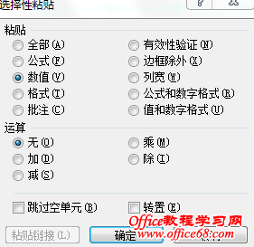 有这样的情况,在Excel中用公式算出来的数值,我们想将得到的这个数值复制到另一格中,此时我们使用Ctrl + C , 然后在另一格中用 Ctrl + V ,本以为可以顺便将这个数值复制到另一格中时,发现情况并不是这么一回事,事实的情况是数字没有数值没有复制过去,倒是把公式复制过去了。 如果我们只想复制数字而不想复制公式,怎么解决? 其实解决的方法很简单,那就是要用到excel的一功能,就是“选择性粘贴”。当我们将某一格的内容用Ctrl + C复制后,我们不能直接用 Ctrl + V 直接粘贴到另外一格,正确的做法是在另外一格上面 点击右键 –> 选择性粘贴, 然后在弹出的对话框中选择 “数值” 即可将数值成功粘贴过去。如图: