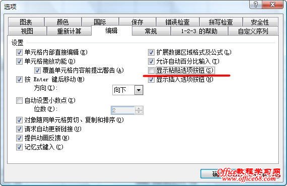 单击菜单“工具→选项→编辑”,取消选择“显示粘贴选项按钮”即可。