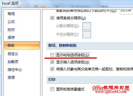 依次单击“OFFICE按钮→Excel 选项→高级”,在“剪切、复制和粘贴”区域中取消选择“显示粘贴选项按钮”。