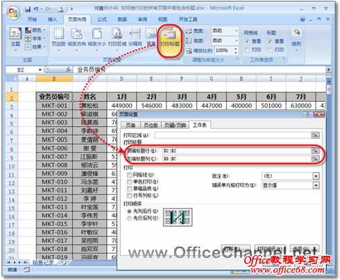 1)打开需要打印的工作表,在“页面布局”选项卡的“页面设置”选项组中,单击【打印标题】按钮,打开“页面设置”对话框,并自动定位到“工作表”选项卡。