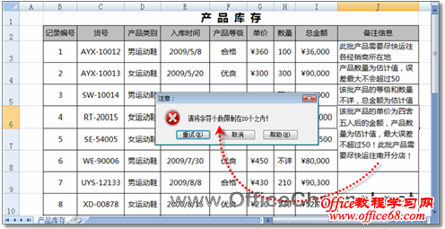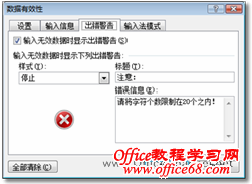 图3 当输入20以上字符时需要显示的警告信息 (4)单击【确定】按钮返回工作表,当向添加了限制的单元格区域中输入超过20个字符的内容时,系统将自动打开提示对话框,要求用户将输入的字符个数限制在20个之内,如图4所示。