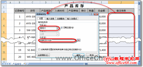 图1 由于输入的文本内容过多而无法在工作表中完整地显示出来 (1)选中需要添加限制的单元格区域,在“数据”选项卡的“数据工具”选项组中,单击【数据有效性】按钮,打开“数据有效性”对话框。 (2)在“设置”选项卡的“允许”下拉列表框中,选择“自定义”,然后在“公式”文本框中输入公式“=LEN(J3)<=20”,如图2所示。