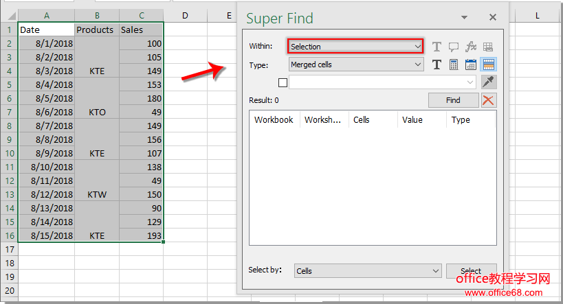使用Kutools for Excel在合并单元格中查找特定值
