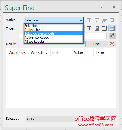 2。 然后a 超级查找 窗格显示在工作表的右侧。 要查找范围内的值,请选择范围,然后选择 选择 来自 下拉列表。 看截图: